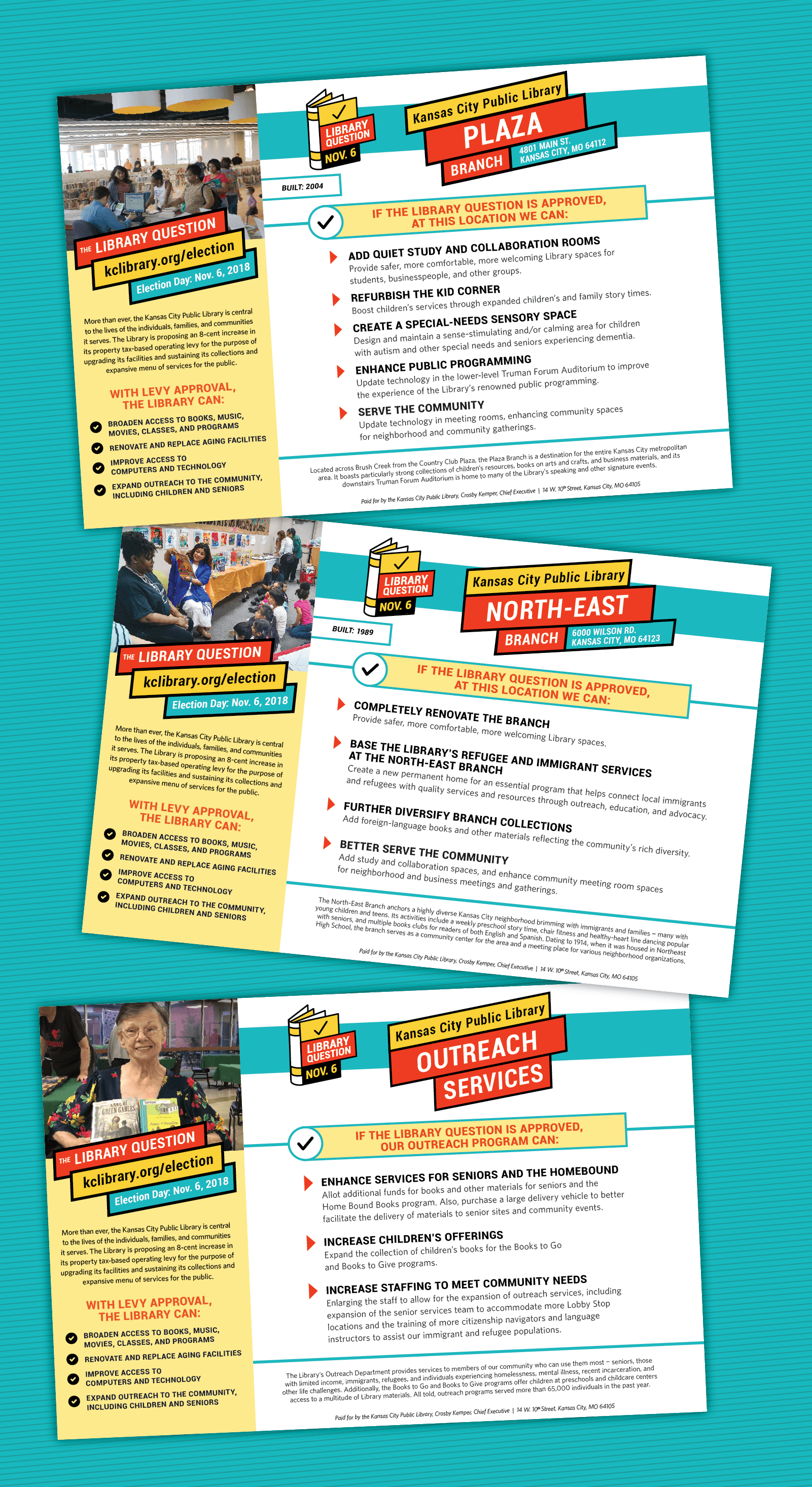The campaign was developed on a fairly short timeline; the decision to go before Kansas City voters came in late summer of that year in order to meet the deadline for appearing on the November ballot. The Library's Public Affairs team had to quickly prepare a suite of materials for staff to use in outreach and education efforts, as well as planning public-facing marketing tactics.